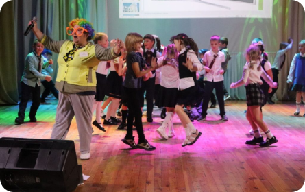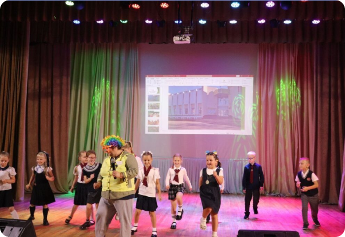Позитивное настроение на сцене с детьми поддерживал «Чемпион Мира по смеху и веселью🌏 — Тренер Свистулькин».