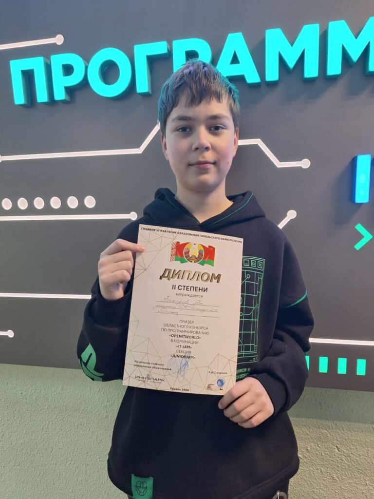 На областном конкурсе по программированию «OpenITWorld» учащийся отдела компьютерных технологий Захаров Ян награждён дипломом II степени в номинации «IT-JAM».