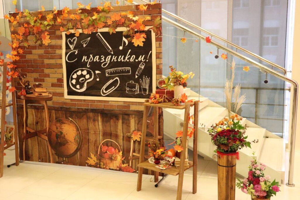осенние тематические фотозоны «За все мы Вас благодарим!», «Учитель – это свет!», «Школьные года чудесные», «Все мы родом из детства», «Пусть осень дарит вдохновенье»,